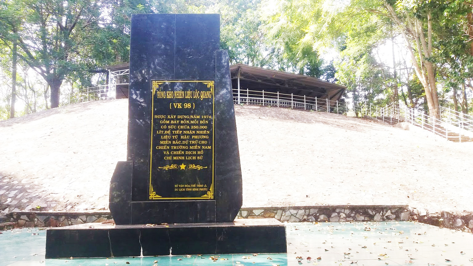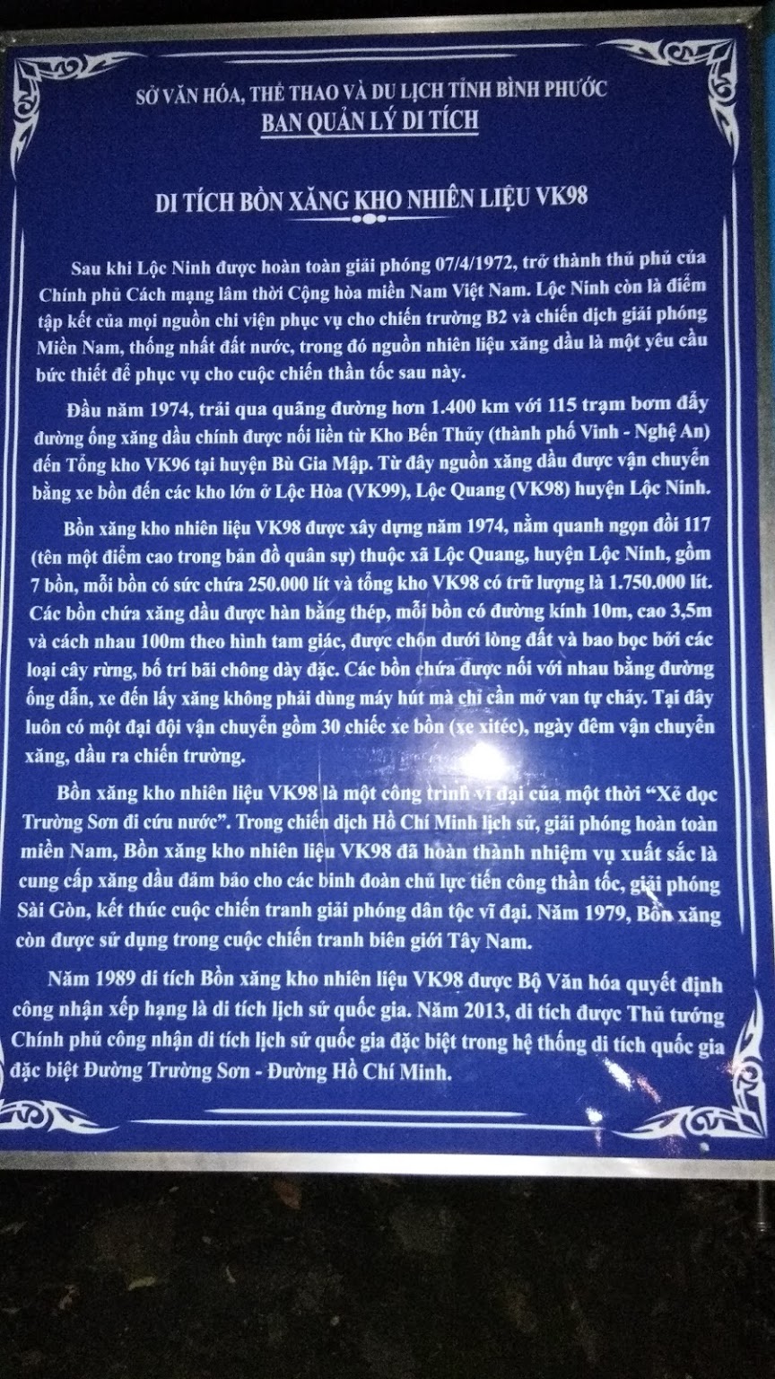 Tổng kho nhiên liệu VK98 được xây dựng năm 1974, tọa lạc quanh ngọn đồi 117 (tên một điểm cao trong bản đồ quân sự) thuộc xã Lộc Quang, huyện Lộc Ninh, với diện tích 10ha, gồm 7 bồn, mỗi bồn có sức chứa 250.000 lít, Tổng kho nhiên liệu VK98 có trữ lượng 1.750.000 lít. Các bồn chứa xăng dầu được hàn bằng thép, mỗi bồn có đường kính 10m, cao 3,5m và cách nhau 100m theo hình tam giác, được chôn dưới lòng đất, bao bọc bởi các loại cây rừng có bố trí bãi chông dày đặc. Các bồn chứa được nối với nhau bằng đường ống dẫn, có độ cao so với mặt đường nên xe đến lấy xăng không phải dùng máy hút mà chỉ cần mở van để nguyên liệu tự chảy vào bồn. Một đại đội gồm 30 chiếc xe bồn (xe xitéc), ngày đêm vận chuyển xăng, dầu từ trạm VK96 Bù Gia Mập về tập kết tại Tổng kho nhiên liệu VK98 và vận chuyển xăng dầu ra chiến trường. Sau ngày giải phóng đất nước, các bồn chứa xăng dầu được Hậu cần Quân khu 7 tháo dỡ, còn lại một bồn phục vụ nhu cầu tham quan, tìm hiểu của nhân dân.